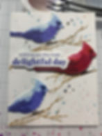 I started with Canson Watercolor paper and stamped a total of 4 cardinals from the Winter Cardinal Stamp and Die Bundle (see tips to see how you can do this quickly and easily). I then die cut all the cardinals and branches. I cut a piece of 8 ½ x 11 Solar White cardstock in half to make my card base. I then cut a piece of Canson watercolor paper to 4 ¼ x 5 ½ to fit the front of my card base. I used Altenew’s watercolor brush to add splatters to my panel by adding a smoosh of ink to my glass mat and adding water, then used a flicking motion to add the splatters. While that was drying, I colored the branches with OLO Markers to give some depth and dimension. Once the panel was dry, I used Bearly Art glue to glue the branches to the panel. I used foam adhesive to add dimension to the cardinals and popped one on each branch. I only ended up using 3 of the 4 I die cut, but you can never have enough die cuts. 😊 I then stamped and die cut the sentiment from Delightful Day stamp and die bundle and popped that up on foam tape as well. I then glued the panel onto my base and added the Glossy Accents to the eyes of the cardinals and some iridescent gems for some sparkle.